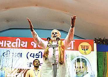 That Modi has managed this feat is in itself a testament to the man's drive and ambition. He has crafted his own image carefully, adopting the style and mannerisms of popular Gujarati godmen like Morari Bapu. The finger-pointing hand movement, the V-sign with his hands, the confident stride, the trademark half-sleeve kurtas with tight churidars or the full-sleeved, tailored variety with buttoned sleeves. Even the Modi look is carefully cultivated.