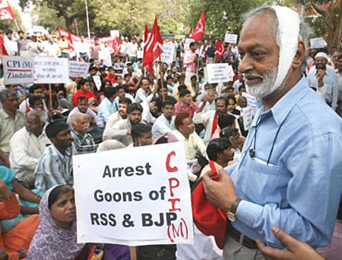 So intense and bitter is the divide that saffron activists and red cadres have carved out the land between themselves. Cutouts of the hammer and sickle, or saffron flags and RSS painted on electric posts, on roads or walls announce whose fiefdom a particular village is. Those believed to be subscribing to a rival ideology are rendered persona non grata in the village and are possible targets. Respective party cadres are on a constant vigil. Any unauthorised entry is challenged. A stranger who might stray in accidentally is followed closely till it's certain that he is not an 'enemy'. Even buses, run by sympathisers of the two groups, stop only at 'friendly' bus stops.