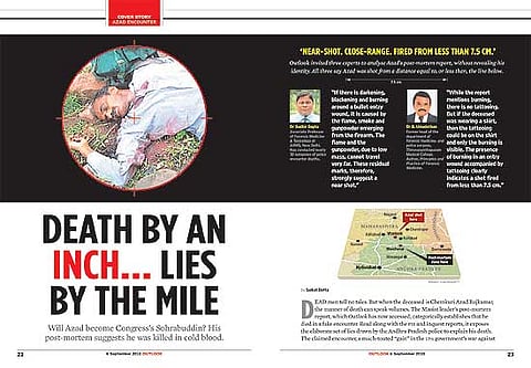 The post-mortem on Azad’s body was conducted on July 3, 2010, by two doctors of the Mancherial government hospital, ENT surgeon Dr Neelakanteswara Rao and anaesthetist Dr Chandraiah. Both are civil assistant surgeons and Dr Rao is a veteran of over a 1,000 post-mortems. Dr Chandraiah told Outlook that he had written the post-mortem report as Rao dictated it out to him. Sources close to one of the doctors say he firmly believes the blackening of the wound near the chest and the tattooing near the one on Azad’s right shoulder clearly indicate that the shots were fired from close range, probably less than three feet. Since the case is in the Supreme Court, it is likely the doctors will be called in to testify at some point.