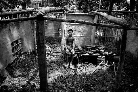 Suraj Jamal Mallick, 12, a student of grade VI sits in front of his broken house. Every year, with every new inch shrinking, several people in the Island are becoming homeless. These people have been termed “environmental refugees”.