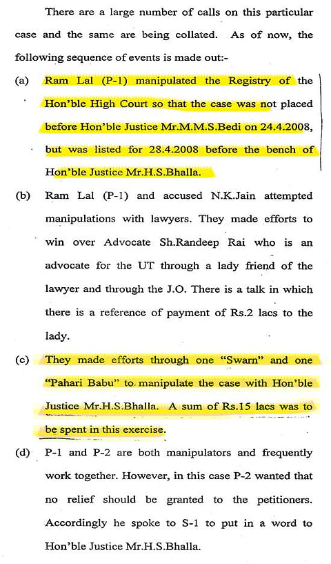 The Vigilance Bureau had stumbled on the goings-on while investigating a criminal case which required that the telephones of two people in Punjab be tapped. The names of two judges of the high court—Justice Mehtab Singh Gill and Justice H.S. Bhalla—and an additional district judge of Ferozepur, J.S. Bhinder, figured in the reports signed by Vigilance Bureau director Sumedh Singh Saini. The bureau is still awaiting sanction to proceed in the matter.