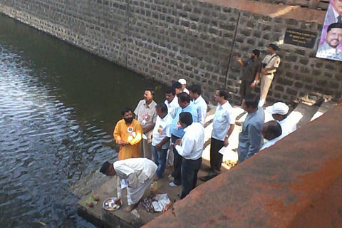 Gogawale’s office said “no purification was done”; it was only a worship of the water. Not buying that, a 2,000-strong group marched to the lake in protest and conducted a mock funeral. The protesters included members of the Republican Party of India (Athavale), which is in fact an electoral ally of the Sena-BJP and was instrumental in getting Gogawale elected against Congressman Manik Jagtap.