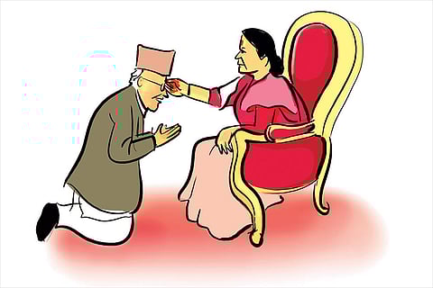 It’s quite a scene to picture: a former chief justice kneeling to receive ‘tilak’ from an enthroned president. That’s what happened in Kathmandu on Vijayadashami, when a retired chief justice of Nepal’s Supreme Court, and other government officials, called on President Bidhya Devi Bhandari at her house. She applied the tilak—or ‘tika’—to the supplicants’ foreheads while sitting on a high chair. Pictures of the event went viral and provoked criticism, with a bureaucrat saying, “Why should the head of a secular state maintain royal tradition and treat people...as subjects?” Not one to be outdone, PM K.P. Oli opened his official residence and offered the same beneficence on the day, in a manner condemned as “feudal” by ex-PM Baburam Bhattarai.