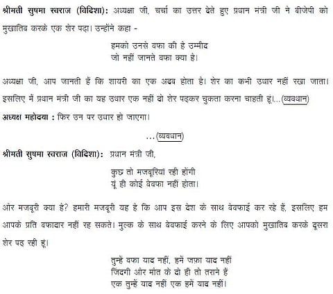 In response to the PM's reply, the leader of opposition in Lok Sabha, Sushma Swaraj, addressed the speaker and said: