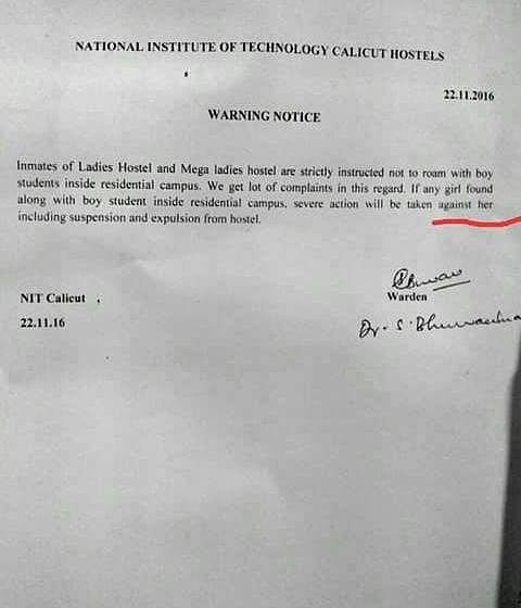 The National Institute of Technology, Calicut, has released a circular forbidding female students from hanging out with the boys in college – and topped it with a misogynistic threat to expel only the former.