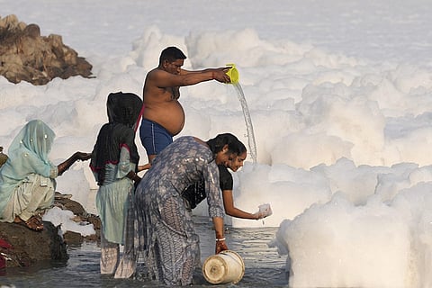 People at the Yamuna bank as toxic foam floats on the surface of the polluted Yamuna river, at Kalindi Kunj, in New Delhi.