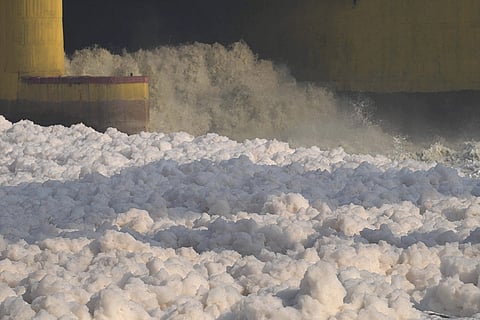 Toxic foam floats on the surface of the polluted Yamuna river, at Kalindi Kunj, in New Delhi.
