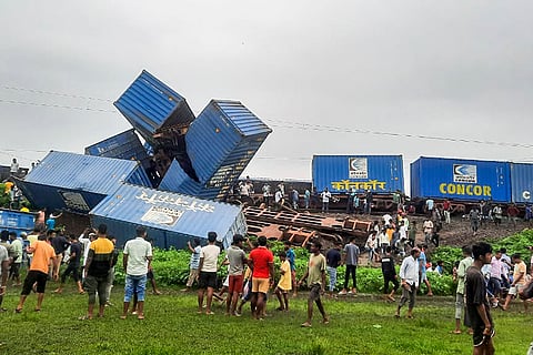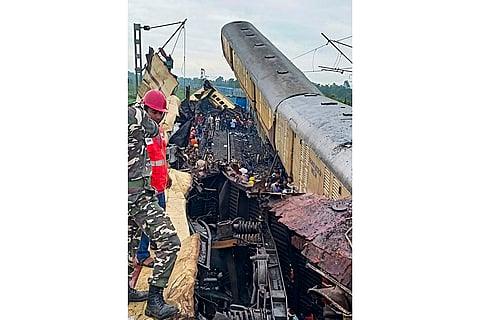 Remains of coaches after a collision between the Kanchanjungha Express and a goods train, near Rangapani railway station.