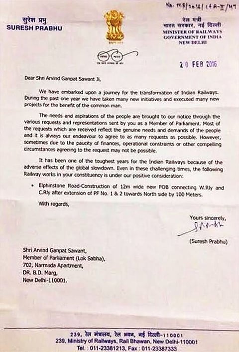 A letter dated February 20, 2016 sent by the then Railway Minister Suresh Prabhu to South Mumbai MP Arvind Sawant also conveys that issue of the Foot Over Bridge linking Elphinstone Road and Parel suburban stations needed urgent attention.