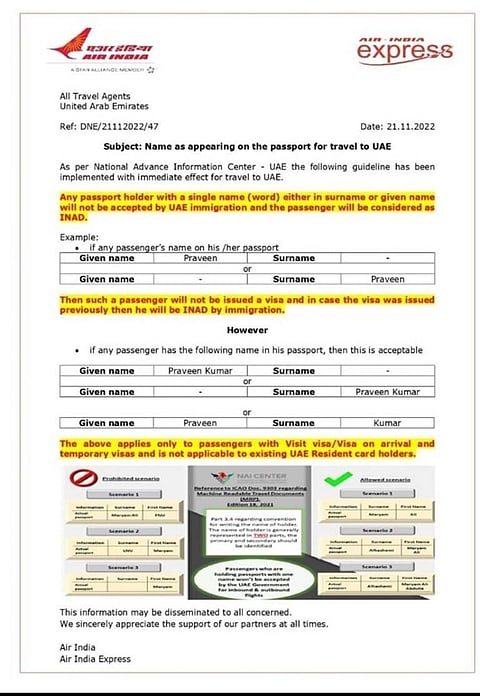 The circular jointly issued by Air India and AI Express has notified that any passport holder with a single name will not be accepted by UAE immigration.