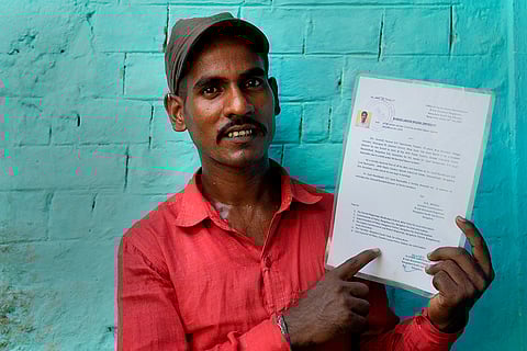 Govind Paswan, a former bonded labourer from Sitamarhi district of Bihar showing his release certificate. After rehabilitation, Govind has now become ward member of his panchayat.