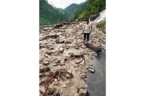 Tharali-Karnaprayag road blocked by the debris following a landslide, in Chamoli district.