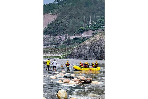 SDRF personnel conduct a rescue operation for 2 people trapped in the middle of the Bhagirathi river, at Chinyalisaur in Uttarkashi.