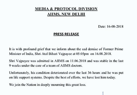 In a statement, AIIMS said that former prime minister Atal Bihar Vajpayee passed away at 5.05 pm on Thursday.