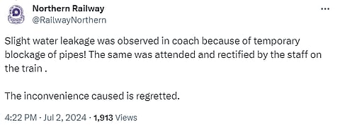 The official X handle of the Northern Railway responding to one of the many posts that shared the video said, "Slight water leakage was observed in coach because of temporary blockage of pipes!"