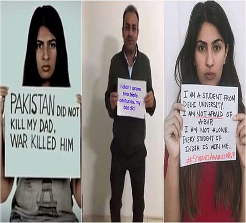 Sehwag’s tweet came after Kaur – daughter of Kargil martyr Captain Mandeep Singh – changed her Facebook profile picture to one with her holding a placard that says: “I AM A STUDENT OF DELHI UNIVERSITY. I AM NOT AFRAID OF ABVP. I AM NOT ALONE. EVERY STUDENT OF INDIA IS WITH ME. #FIGHTBACKDU #STUDENTSAGAINSTABVP”. In April 2015, her video said, “Pakistan did not kill my dad, war killed him”.