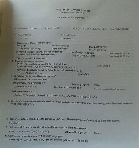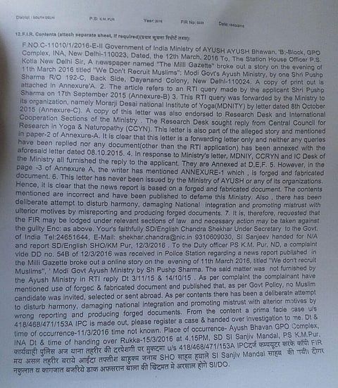 The ministry lodged a FIR with the Kotla Mubaraqpur PS against Sharma on March 15 under sections 418, 468, 471 and 153A of the Indian Penal Code. The ministry has claimed that the annexure is a forged document and was used by Sharma to cheat the public. Section 153-A has been added because the ministry feels that he was trying to create communal tensions using a false document.