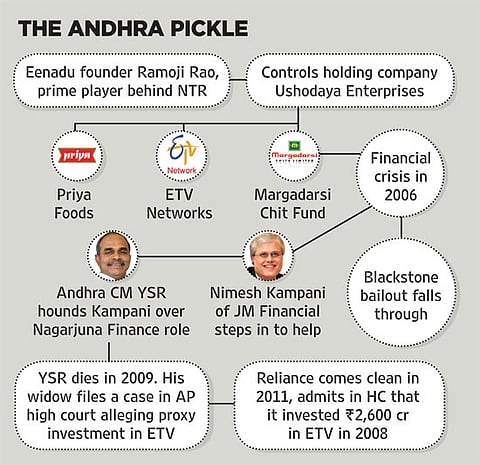 The origins of Reliance’s complicated takeover of Network 18 in 2014 can be traced back to Andhra Pradesh, home to Ramoji Rao’s sprawling Eenadu newspaper and television network—and gas off the east coast in the Krishna-Godavari basin, whose pricing remains a hot-button issue, whether it is the UPA or NDA in power.