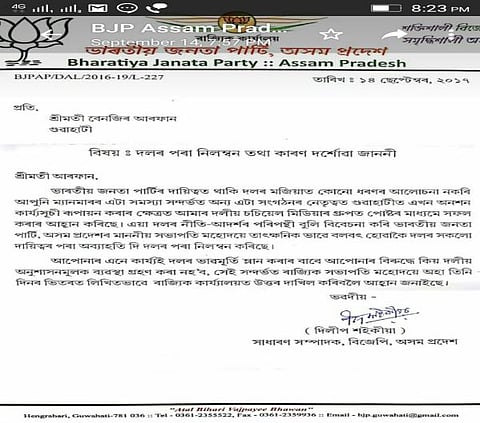 The Bharatiya Janata Party (BJP) in Assam has suspended state executive member of Bharatiya Janata Mazdoor Morcha Benazir Arfan with immediate effect for accepting an invitation for a prayer meeting held by an NGO against the killings of Rohingya refugees by Myanmar armed forces.