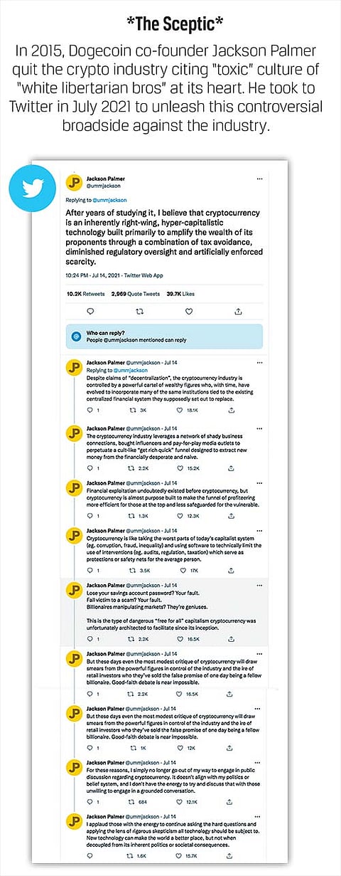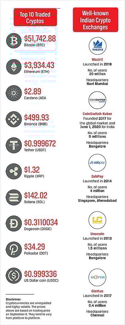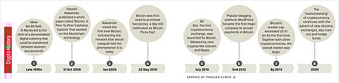 A cognitive gap divides the world as it exists and the new world that’s dawning on us as we speak, lining the horizon in strange, abstract hues. One sign of that came, dear reader, even as we were assembling this cover story for you. Our in-house photo team, in their normal course of duty, wondered how they could “photograph cryptocurrency”. Language can handle abstraction—through special vocabulary or through metaphors that hark back to the material world. Digital coins, blocks, chains…and mining. But how do you visualise something that doesn’t even exist as a tangible thing? That we would arrive on the edge of such a conceptual gorge could have been foretold. Mail had long gone digital. Photography itself had decidedly moved out of the confines of physical film by the 1990s. Heck, by now, even we are getting dissolved into bits, bytes and pixels and getting recomposed as apparitions on a Zoom screen. Money was bound to follow them into the ether. Zipping around on digital pathways for years anyway, it was pre-scripted that the object too would, at some stage, pass through the mirror.
