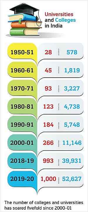 In his last letter to Mahatma Gandhi, Rabindranath Tagore wrote: “Visva Bharati is like a vessel carrying the cargo of my life’s best treasure and I hope it may claim special care from my countrymen for its preservation.” The school Tagore founded at Santiniketan in 1901 grew into the Visva Bharati university. The motto he chose for Visva Bharati, Yatra Visvam Bhavatyekanidam, “where the whole world can find a nest”, reflected his global and cosmopolitan vision for the institution. Today, when India boasts of almost 1,000 universities and 52,627 colleges, a vast improvement from 1950 when we had only 28 universities and 578 colleges, have we created those 1,000 vessels “where the whole world can find a nest?” Almost three-quarters of those 1,000 universities have been set up since 2000 when India had only 266 universities and 11,146 colleges. In the past two decades, India has built 734 universities and 41, 481 colleges—a very high count of higher education institutions (HEI), an extraordinary record in terms of sheer numbers. Most of these are private institutions churning out engineers and managers.