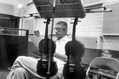 Part of the magic of Satyajit Ray’s productions was in the sense of an extended family that cast and crew were drawn into, often necessitated by the microscopic budgets they worked within. It led to lifelong friendships and creative collaborations, with the possibility of learning on the job, and often discovering hidden talents. The best known among the many hangers-on is undoubtedly Kamu Mukherjee, who joined Ray’s team as a gaffer, impressed everyone on set with his myriad talents at entertaining with tricks and treats, and ended up playing some of the most memorable comic and villainous roles in Ray’s films—from the advertising professional trying to hustle his wife in Nayak, to the “globe-trotting” kidnapper Mandar Bose in Sonar Kella and the drunk knife-thrower in Joy Baba Felunath. What a magical time it must have been—those Sundays at the Ray home on Bishop Lefroy Road, with actor Soumitra Chatterjee, art director Bansi Chandragupta, still photographer Nemai Ghosh and many others discussing Ray’s next project over lunch prepared by his wife Bijoya.