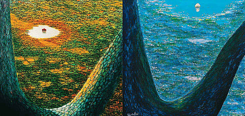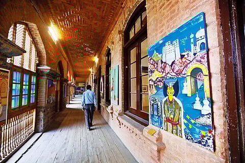 The imposing stone and brick edifice conveys well the everyday reality of Kashmir: a huge bunker rests at the gate of the building, cheek by jowl with coils of concertina wire. Security forces check everyone before allowing them in. Barracks of paramilitary forces lie in the grounds. The two-storey building—known as the “stone building”—constructed during the Dogra rule, in the old secretariat complex in Srinagar, now is a temporary art gallery showcasing heritage material as well as contemporary works of Kashmiri art. The gallery in the stone building was inaugurated by Lt Governor Manoj Sinha on August 15 this year. So far, only eleven persons, including this correspondent, have visited it.