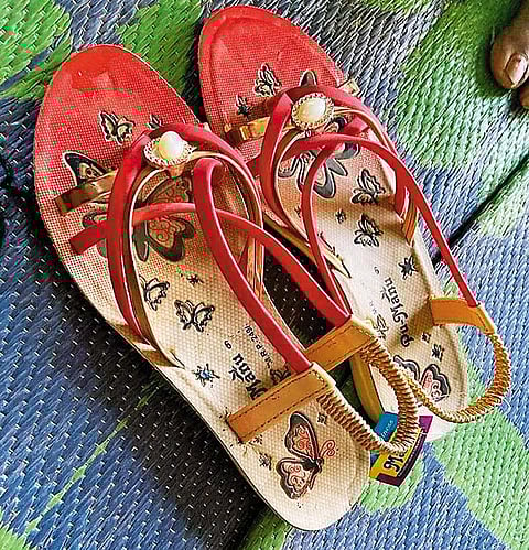I remember the red and beige sandals with butterflies printed on them. A big butterfly in flight and smaller ones trailing it. An imitation pearl stuck on each strap. A canvas almost. It could be a red sky dotted with innocent ambitions of the butterflies. I have since then looked for the meaning of red sky. It’s said a red sky in the morning is a warning of stormy weather. She was fatally raped on one such morning. Among all that remains of her is that pair of plastic sandals. Unworn. Her brother had bought it for her for Diwali.