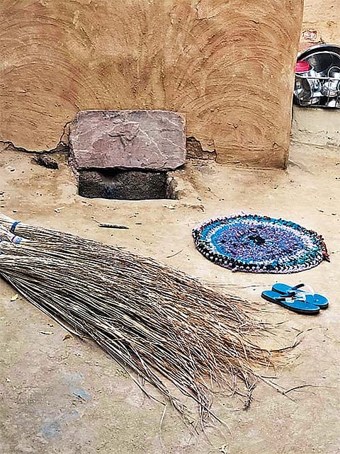 A mat and brooms, made by the Hathras rape victim, lying in the front yard of her home in Bulgarhi