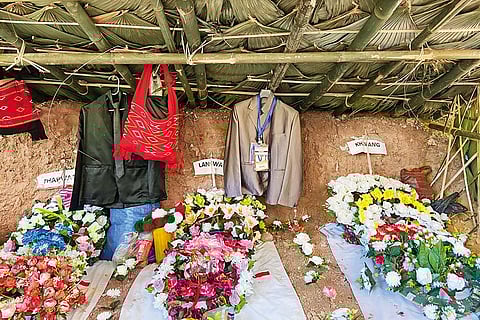 When you enter Oting on top of a mountain, a white banner awaits. It says, “Welcome home our beloved brothers”. It sets the narrative of grief in this small village. At the graveyard, there are no plinths yet. It is too early. It has only been nine days since the deaths. A structure stands. It is bigger than the others. Like a hut with thatched roofs held together with bamboo poles. Inside, there are twelve fresh graves. Alongside and on top of the graves, there are various things. Perhaps the dead loved those or they are just offerings by the family and the villagers. One even had a wedding suit. The man had been married for only nine days. His widow Monlong hung the suit at the grave of Hokup. Hokup was one of the miners. He was killed later that evening when he went to look for his friends after they heard the gunshots. He had been at the Tiru mines then.