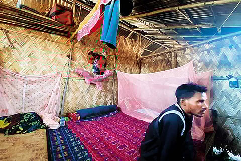 The pink mosquito net has a rose attached to a string. A pink rose made of cloth. Two windows on two walls and a square plastic sheet for the baby on the bed. A world in its own right. This was their room. There’s a wooden box in her room next to the door. Ngamlem, 30, takes out a brown wool peacoat and lays it out the bed. It is a gift. For Christmas. Langtun, 37, is no more. He probably bought it from one of those shops in Mon’s Christmas market where they sell second-hand coats and jumpers. She moves her hand across the lapel to iron out the creases. They were married last September. There was no white wedding. He had fallen in love in Tiru, where she comes from. There will be no Christmas celebrations this year. In the other room in this old house, there is a framed poster. It says Rejoice in the Lord. She looks at it and then walks out of the door. The child is sleeping in her father-in-law’s lap.