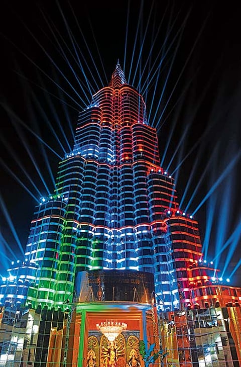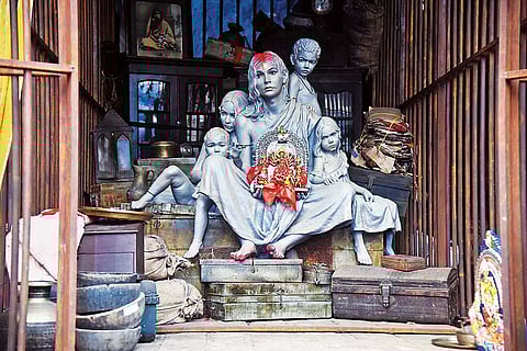 Standing against a bright red backdrop, the Goddess looks straight into the eyes of the visitors. She has no weapons in her ten hands. She is not killing Mahishasur with her trident; in fact, there is no Mahishasur at all! Instead, she is using two hands to cook, and two others to serve cooked rice, and holding plates of cooked food in six other hands. In two other rooms, Ganesh is working on his laptop and Kartik is idly sitting on a chair.