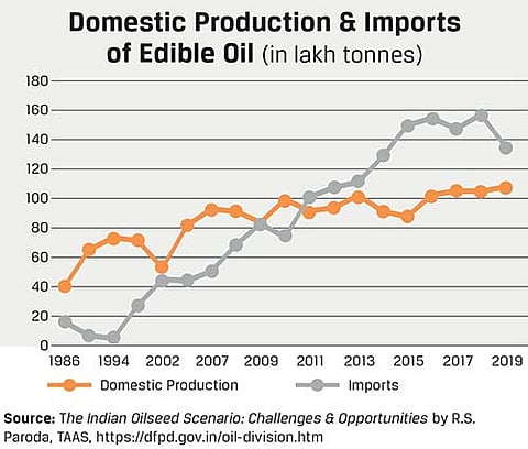While our production of edible oilseeds has stagnated at around 90-100 lakh tonnes since 2007, our imports have shot up from 50 to 150 lakh tonnes in the same period (see graphic). This raises three questions: