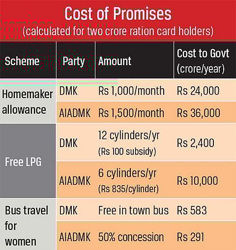 Every year, ahead of the Tamil month of Aadi (July 15 to August 15), retail stores in Tamil Nadu—selling everything from textiles to jewellers to home appliances—flood the market with “Aadi thallupadi” (discount offers), promising the lowest prices of the year to tempt customers. During this discount season, one can witness hundreds of buyers—all eager to grab the discounted items before they fly off the shelves—lining up before the stores even before they open for business. Come election season, Tamil Nadu’s political parties tempt voters with similar schemes that go by the name of election manifestos, and are crammed with freebies and unviable promises aimed solely at grabbing votes. It is no different this year as the ruling AIADMK and its main challenger, the DMK, vied with one another to roll out a slew of promises—many of them near replicas or slight variations of what the opponent promised.