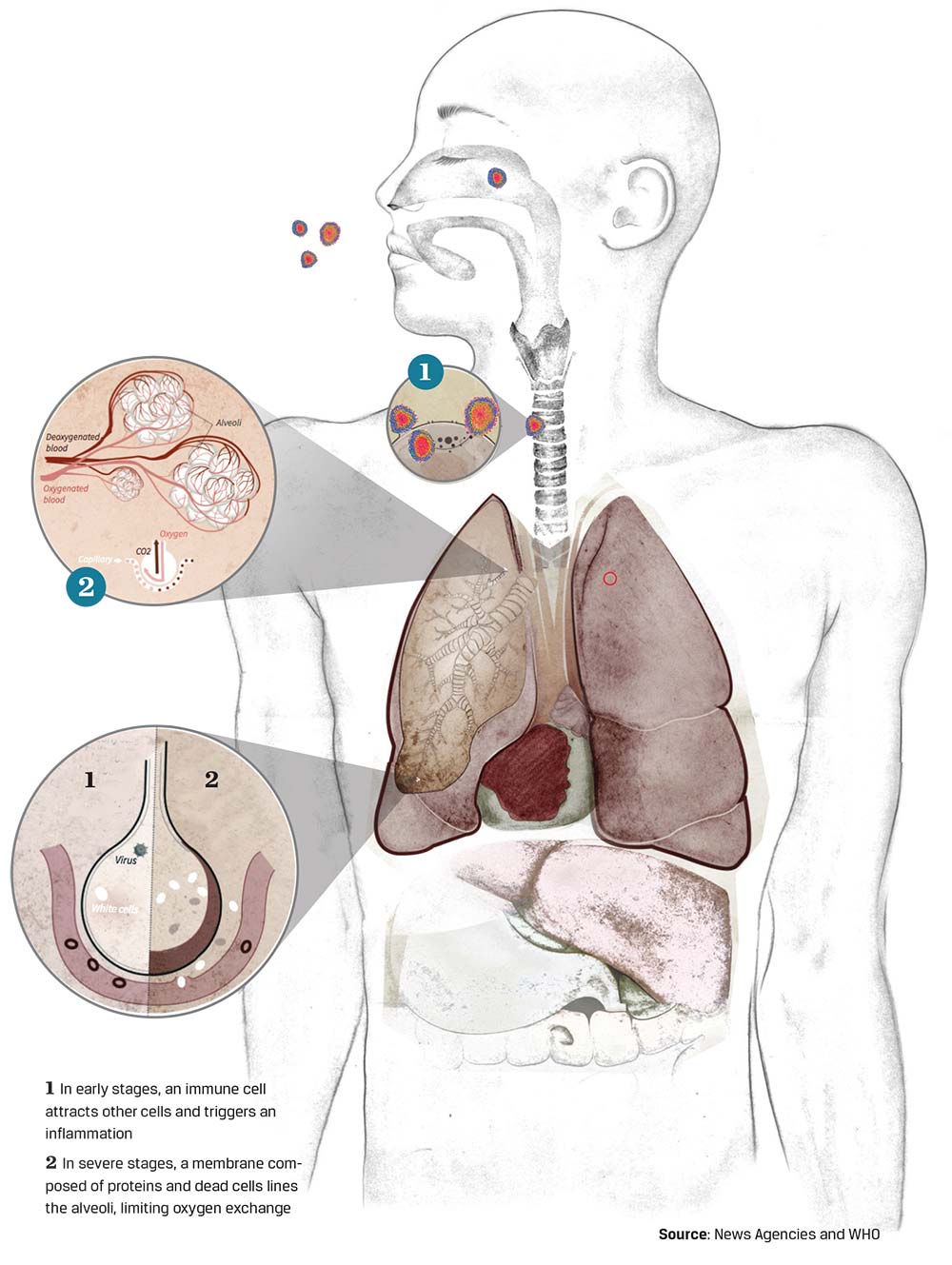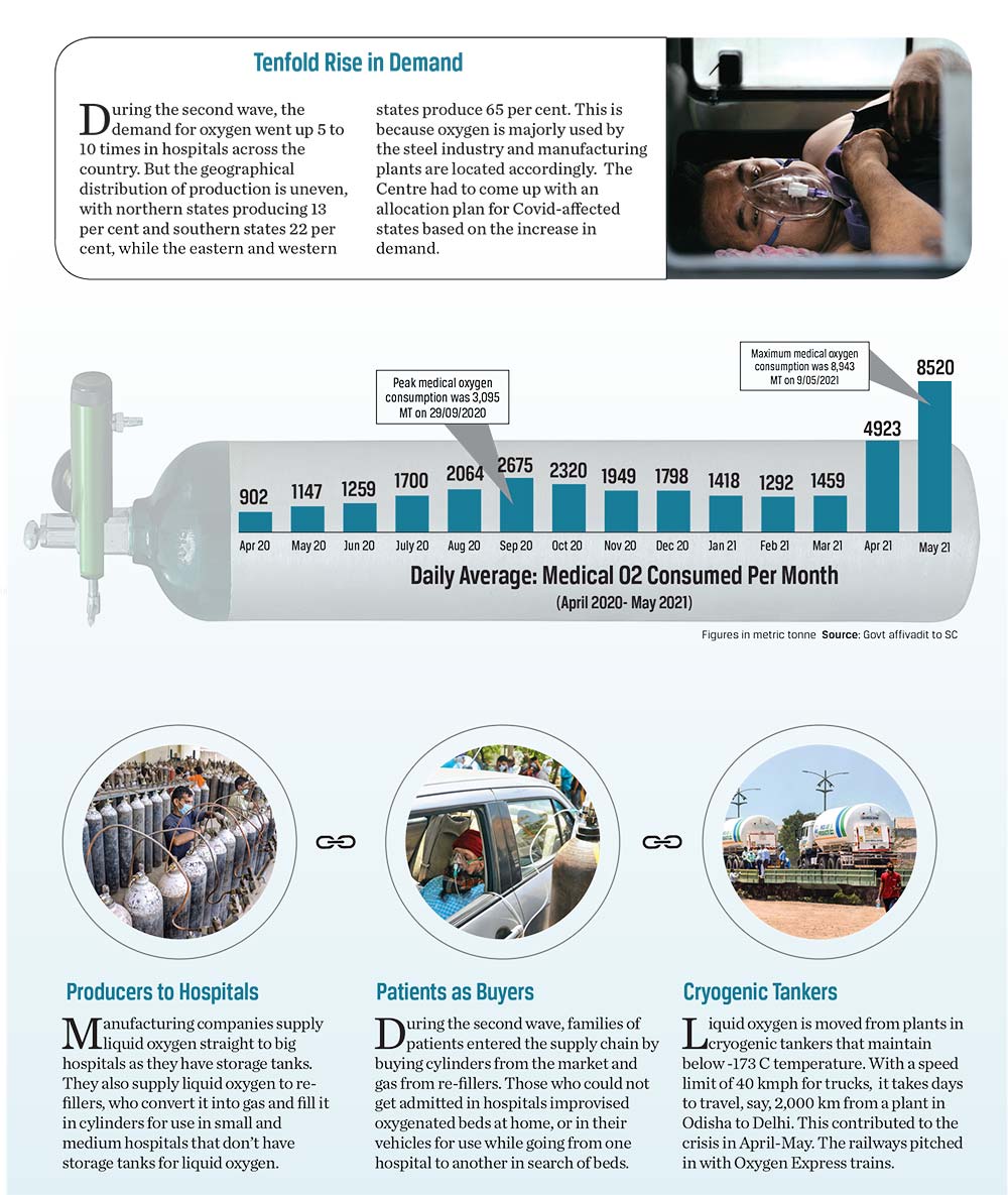April-May 2021: A record surge of Covid-19 swamps India. The second wave. People die in thousands, hundreds die because of a medical oxygen shortage. The government moves medical oxygen to hospitals by air, by train and by road, yet the shortfall can’t be met as the Covid caseload spikes and peaks. Meanwhile, a more infectious and dangerous variant of the coronavirus continues to strangle the infected. Here’s how—the virus enters a person’s respiratory tract through the mouth and nose. 1 It binds to cells in the throat, airways and lungs; hijacks the cell replication process and infects neighbouring cells. 2 Down the windpipe and through bronchial tubes in the lungs, the disease affects tiny air sacs called alveoli. Oxygen within these air sacs travels though small blood vessels called capillaries. It is then delivered to red blood cells. Covid damages and inflames the walls of the air sacs, reducing oxygen supply to the blood and leaving the patient gasping for breath. As the damage to capillaries and alveoli mounts, the delivery of oxygen to the blood reduces further. Patients with such lung failure or reduced lung function require medical oxygen blown into their lungs or directly into the blood by intubation. According to WHO, 19 per cent of critically ill patients or those suffering severe symptoms need oxygen.