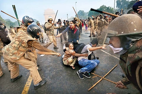 Delhi Police personnel beat agitators at an India Gate protest after the Nirbhaya gang rape in December 2012.