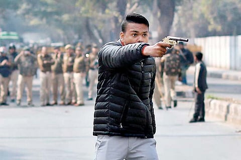 A gunman points his weapon at anti-CAA protesters in Jamia Millia Islamia as policemen look on.