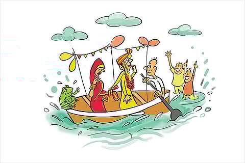 Ready, steady, go take seven turns…you are now pronounced man and wife. Marriage is a balancing act, but what if the wedding itself becomes an act of balance—on a wobbly, wooden boat, that is? It so happened that swathes of north Bihar went under after a heavy dunking of rain, and the groom in Muzaffarpur and his party had to take a boat to the bride’s place, equally inundated by floodwater. It was decided pronto that the rituals would be conducted on the boat—including the saat phere, the seven circumambulations around a holy fire. They did it, without losing their footing, and the newly-weds returned to the groom’s house on the same boat. The groom uploaded his wedding video on social media to let the government know the people’s plight.