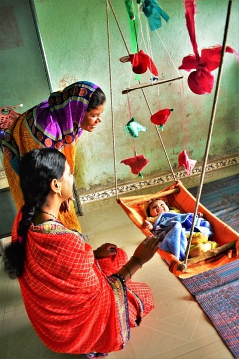 ‘My husband is also very much involved. My mother-in-law is especially very enthusiastic to make play items at home. She made colourful birds from a clean cloth and tied it to the baby’s swing cradle. Now Mayuri looks at the sparrows, raises her hand to catch them, and gives a pleasant smile every time she looks at them.'