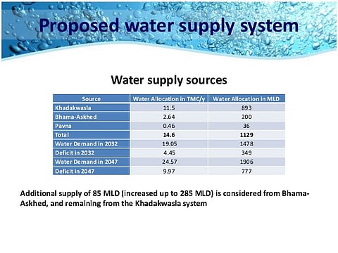 Other schemes like the Bhama Askhed Water Supply project were established in Pune, meant to ease the supply of clean water in the eastern part of the city along the Nagar road for a population of more than 14.50 lakh. The scheme, inaugurated in January, 2021, aims to provide clean drinking water to the regions of Kalas, Sangamwadi, Dhanori, Yerawada, Lohegaon, Kalyaninagar, Vadgaonsheri and Kharadi. However, proper water supply is yet to reach Kharadi, while supply to Yerawada was also stopped after residents of the area complained of sickness due to consumption of unclean water.