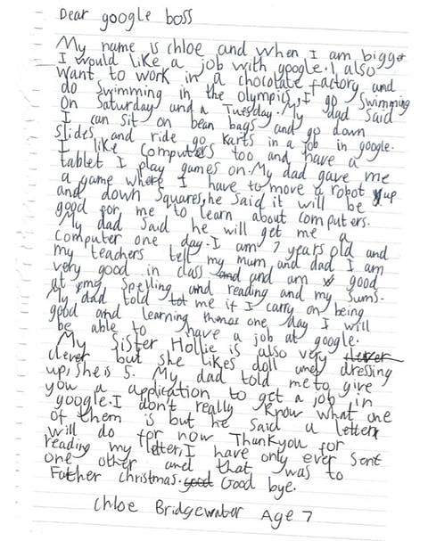 Fascinated by Kindle, tablets and robots, Chloe sent a hand written letter to the 'Google boss', expressing her desire to work at the organisation. She also wants to 'work at a chocolate factory and do swimming in the Olympics.'