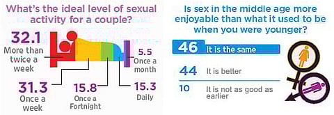 y some tacit convention, the word ‘sex’ is associated with the idea of being young. Sex for the older folks is a category that traditionally goes unnamed—if at all, only in terms of an age where you begin to experience a plateau or a tapering-off of desire. Myths, however, need have little to do with facts, as our opinion poll among middle-aged urban Indians shows. It not only reveals a sexually active generation, but a contented one: 93.9 per cent reported being ‘satisfied’ or even ‘very satisfied’ with their sex lives. Indeed, sex seems to get better with age: over 90 per cent of those polled said sex is just as good, even better. Rather than any sign of the ardour cooling (over a third said they have sex between 11 and 20 times a month), the sexual canvas is widening—over 70 per cent feel more open to experimentation than they were five years ago. Inhibiting factors—children, work, health—persist, but a new wired world has opened doors.