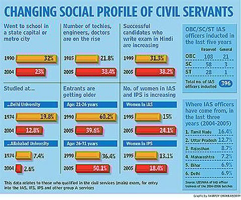Sanjay is the new face of the civil services. Agastya Sen, the metro-born protagonist of Upamanyu Chatterjee's 1988 novel, English, August, with 'St Stephen's College' written all over him, who finds himself in a district town—a "dot in the hinterland"—after joining the IAS, is even more of a rarity than he already was in the '80s and the '90s. The most recent data on the social profiles of the 400-odd who annually clear the civil services exam conducted by the Union Public Service Commission (UPSC) to join the IAS, the Indian Foreign Service, the Indian Police Service and other services, shows that the numbers of those born and schooled in "dots in the hinterland" is rising steadily. The city-born and city-bred, apparently chasing IIMs, MNCs, foreign universities and a plethora of new-economy options, are painting themselves out of the picture. "The easy availability of good jobs not requiring such hard work and preparation to get into, have turned people from relatively affluent backgrounds away from the IAS," says ex-IAS officer and National Advisory Council member N.C. Saxena.