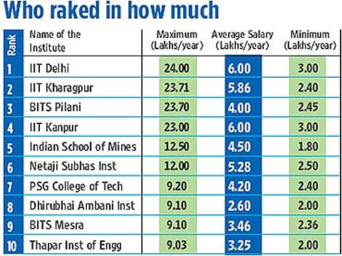 There are great variations amongst the different institutes within a sector too. Among engineering colleges, IIT Kharagpur represents one end of the spectrum. Its faculty of 500, all of them PhDs, has published about 1,400 papers in reputed journals in the last 12 months and hold 90 patents. With Rs 72 crore annual revenues, it tops the list in terms of income earned from consultancy and sponsored research. At the other end are colleges whose research output is non-existent. If we leave out the IITs and private institutes like the Birla Institutes of Technology and Science (BITS) in Pilani and Mesra, there are hardly any publications in foreign journals or patents or revenues through consultancy by college faculties. When it comes to placements, the IITs, BITS Pilani and the Delhi College of Engineering are far ahead. The maximum salary offered in these institutes for Indian jobs was Rs 24 lakh. While the average salary in top-ranked colleges was Rs 5-6 lakh per annum, the figure for others was Rs 2 lakh.