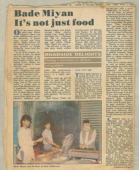 Yes, the 65-year-old legacy of open-air dining is hard to get away from. The legendary food joint that now stands in the shadow of the Taj Mahal hotel was, in 1946, a makeshift stall created by joining together three rickety tables. Everyday, after the Artistic Gift Shop downed its shutters, ‘Bade Miyan’ Mohammed Yaseen would set up shop in front of it. The new wing of the Taj had not come up yet, and the sea breeze would mingle with the mouth-watering fragrance of the kababs roasting over the charcoal grill that wafted across the maidan. And Bade Miyan had not even earned his nickname yet. He was a scrawny 15-year-old lad who “hadn’t even sprouted a moustache”. He had made it his mission to make people happy by feeding them, after his guru, a Sufi fakir, Hazrat Fida Mohammed, had given him `20 to open up a stall. The joint soon began building up a clientele of loyal patrons, mostly from the military, who addressed him first as ‘Miyan’ and then ‘Bade Miyan’ as his reputation, and his beard, grew.