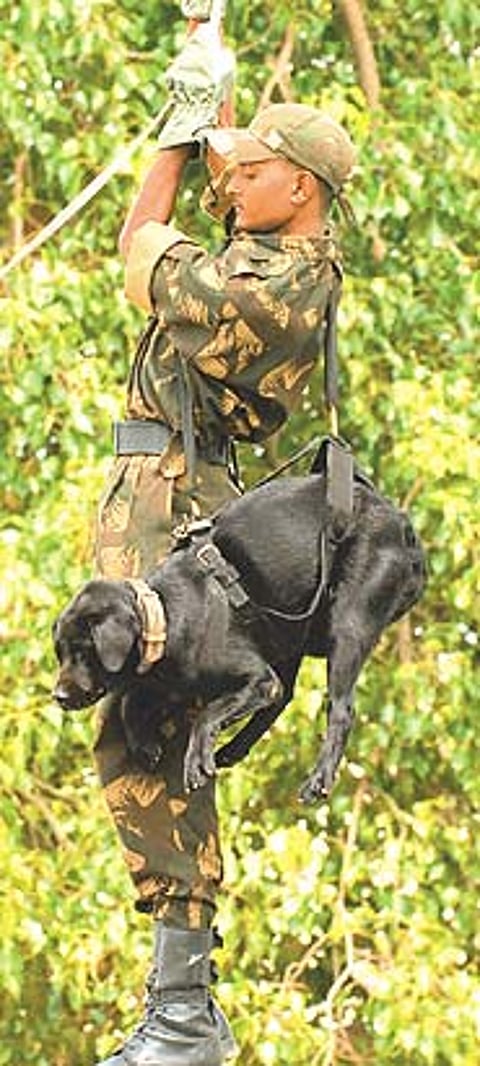 Some dogs are even trained for special operations in 'slithering', to remain poised while making a 15-metre descent from a helicopter while harnessed to their handlers. This, not surprisingly, takes the dogs some getting used to. "The first few times, they go quiet, retreat in fear, they are reluctant," says Brig J.K. Srivastava, commandant, RVC Centre and College. "But they get used to it. It's like someone from a village who faces an escalator for the first time."