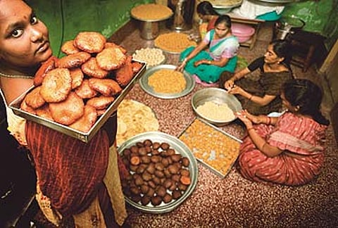 The speciality at these native fast joints is the egg dosa, brushed lovingly with a coating of egg, and served piping hot with a sprinkling of chilli powder, downed with a variety of chutneys, each spicier than the last. By 11 am, Guntur's industrious housewives are grinding the day's supply of vegetables—tomato, lauki, baingan—with what is easily a week's supply of chillies for an average Indian family, to tempt the family's flaming palate. Besides, there will be the usual array of spicy powders, those appetisers like kandipodi ('gunpowder'), so hot that even Gunturians have to lace it with generous dollops of pure ghee and hot rice. And no meal ends without a last lick of Guntur's famous line-up of pickles.