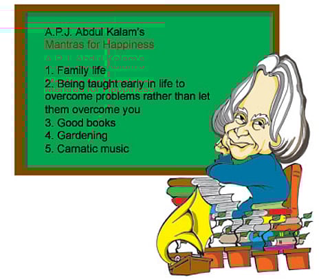Kalam's homegrown rules on how to stay upbeat coincide remarkably with a professional's. For instance, psychiatrist Dr Avdesh Sharma's advice to the increasing number of patients seeking medical help for attacks of panic and anxiety is invariably: 1) Spend time with your family, 2) Maintain good health, including regular exercise, 3) Take up a job, paid or unpaid. Concern for others is a good cure for the blues. 4) Start meditation, even a few minutes of it is good enough to remember that this too shall pass.