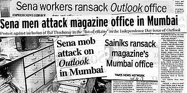 That evening, men of the Sena's south Mumbai unit torched copies of our I-Day issue. The Sena admitted their men had set Outlook copies on fire but denied that any sainik had either organised or executed the attack on our office. The denial carried no currency either with the police or the press. The political class and the media are aware of the repeated threats Sena leaders have been issuing were the Srikrishna Commission report on the Mumbai riots implemented.