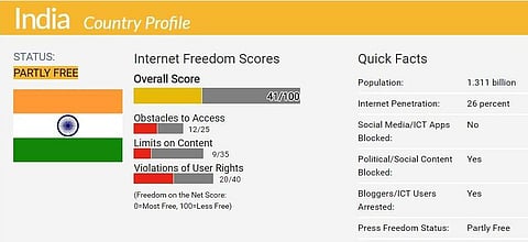 In its “Freedom on the Net 2016” report, Freedom House said India scored 41 (with 0 as best and 100 as worst) for internet freedom.